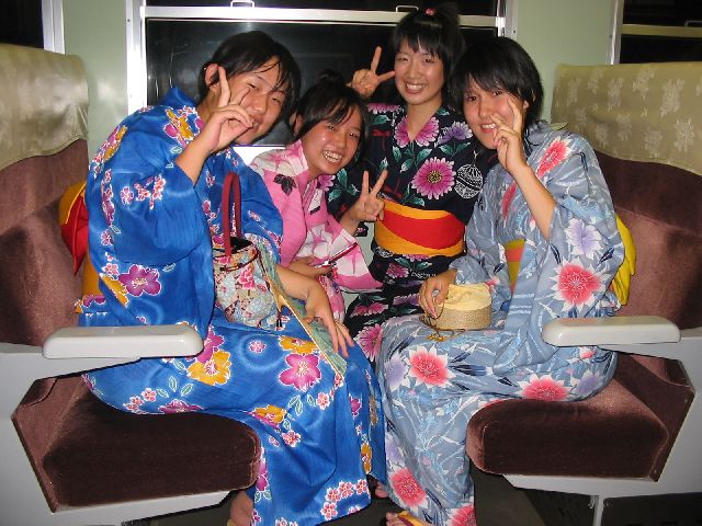 | On the way back, we saw these high school kids all in Kimonos, coming from a festival with fireworks. They told us a little about the festival. They took our pictures, too. They even made a little movie of us for prosperity. |