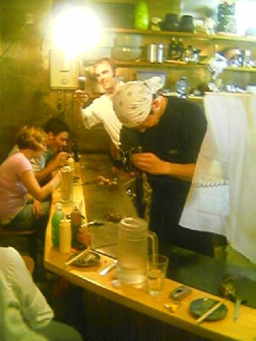 Minato-san is a humble man, but he's the star of the show. Everybody loves him to death because he's so nice. Frequently, he gives us a ride home, since he lives in Aioi. He speaks good English, but he appreciates it if you try to speak Japanese. He loves to take black-and-white photographs with his very old camera. The whole shop is lined with photos of his customers.