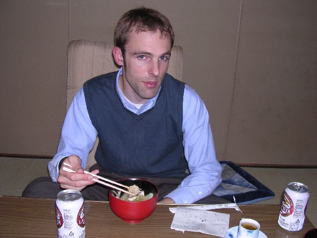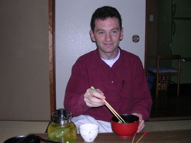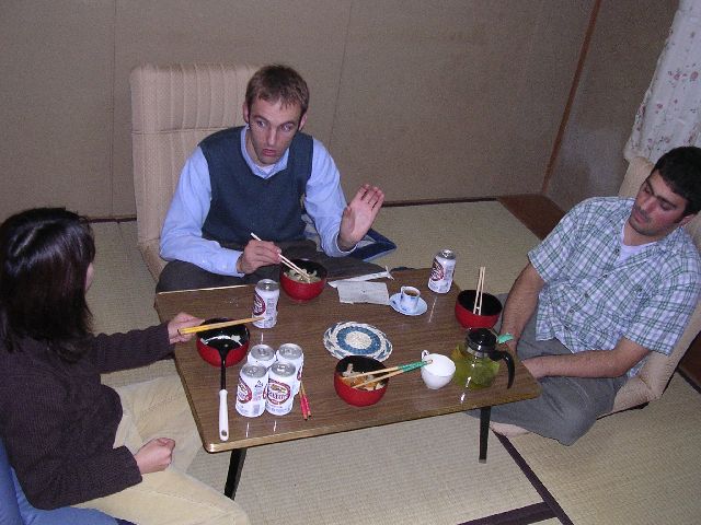 "Nabemono", or just "nabe" is a Japanese stew made from various kinds of seafood and vegetables.  The name just means pot food.  I made a big pot of nabemono and invited some friends over, including Akemi, Nate, and Matt.  Akemi is my girlfriend.  Nate and Matt live in my building.  In this case, I used prawns, clams, large scallops, cod, chicken, leeks, carrots, and shitake mushrooms.  I bought a special nabemono pot (≈¥900 / ≈$9.00) for the occasion.  We ate in the dining room in my apartment, which is a Japanese style room with tatami mats, a short table (≈45 cm / ≈18 inches), and special chairs for sitting on tatami mats (zaisu).  For dessert, we had green tea ice cream.  Although I had intended to cook everything, Akemi did about 3 quarters of the cooking.  She hates to sit and watch me cook.