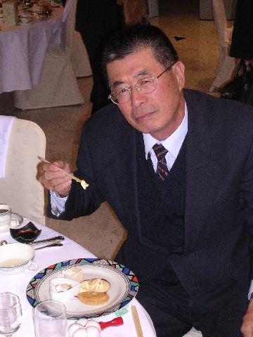 | Our vice principal, Mr. Andou, enjoying dessert. Dessert, like everything else, was fancy and elaborate. There was a little bit of ice cream, a small cake, a dish of fruit, and a couple other things. |