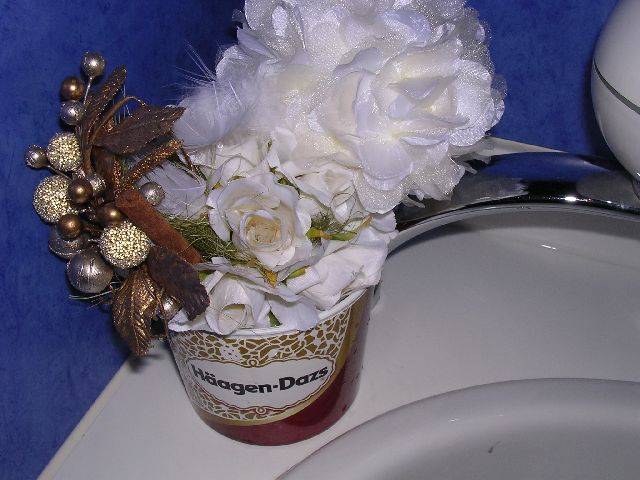 | Note they have a custom-made branded pot for the potpurri and girly decorations. They must have had some kind of fancy interior designer for the bathroom. |