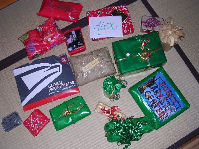 | My mom and my uncle Jeff sent me many Christmas presents. My mom in particular sent lots of stuff. I know I'll like it all. More importantly, it's touching that they're so concerned with taking good care of me during the holidays. I just took this picture so I could remember. This isn't everything, but you get the idea. I've also gotten some beautiful cards and letters from my friends Chika (in Japan) and Wally (in Maine). |