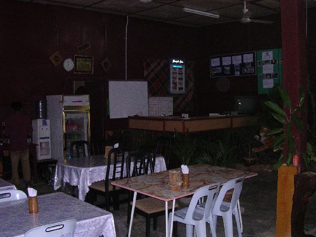 | The dining area at the lodge. It was open air. Very, very casual. Basically, the wife of the owner of the place cooks for the guests if they're too lazy to go out to a restaurant. The food is dirt cheap. An omelette or a plate of noodles with chicken or a bowl of Thai tom yum soup all cost about 3 Malaysian ringit (≈$0.83, ≈¥83). |
