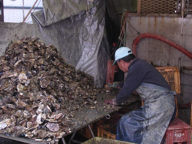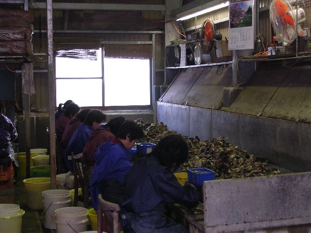 Before we went to the Kaihou fish market, we stopped in this oyster market. It's not really a market at all. They're just processing oysters, but they'll sell oysters to anybody who stops by. And, they're really good, really fresh oysters. Really tasty.