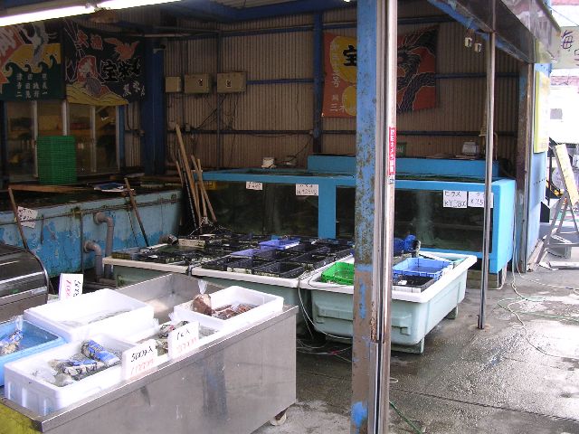 | Fish are sold from big tanks. They come directly from the sea into this place. It's much like buying fish at a fisherman's wharf, but it seems fresher than what we have back in Seattle. Quite a bit of it is still alive, including many of the fish. |