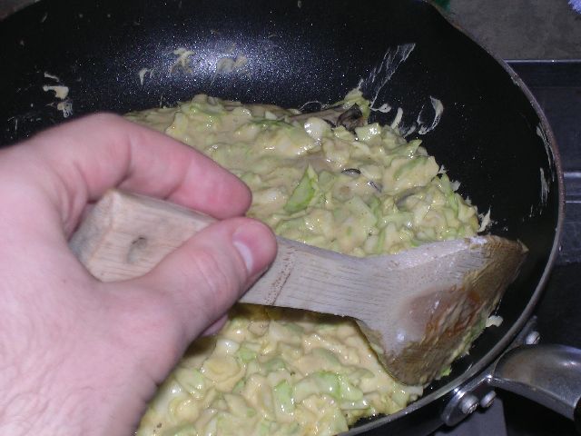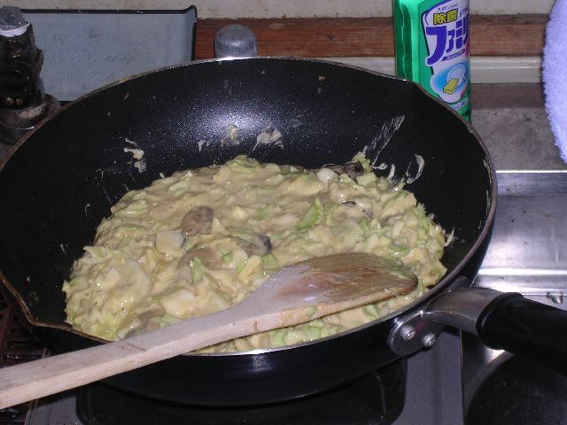 | Oyster okonomiyaki, in progress. |