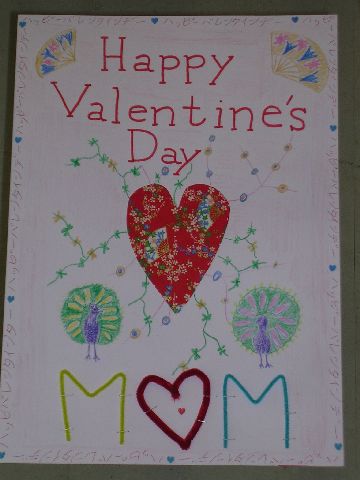 I made a Valentine's Day card for my mom. I went to a bookstore and loaded up on crayons, colored paper, ornate origami paper, stickers, etc. Then, I came home and went to work. My mom asked that I post this, I guess so she could show her friends.