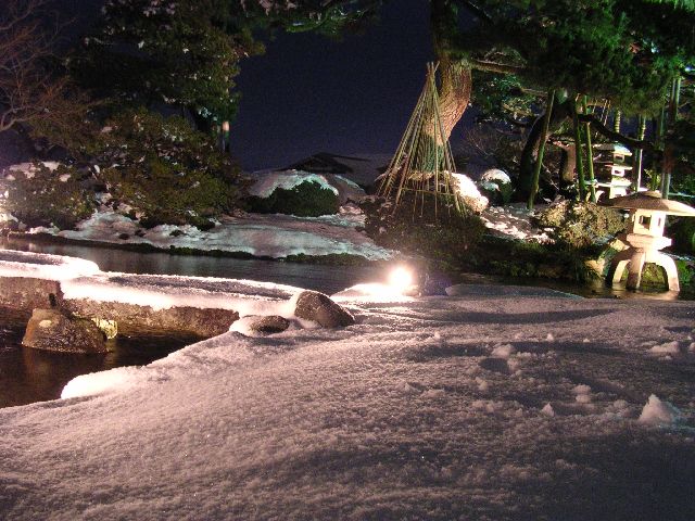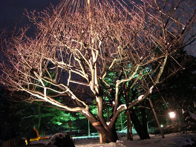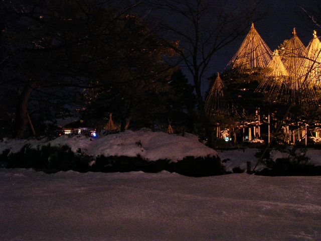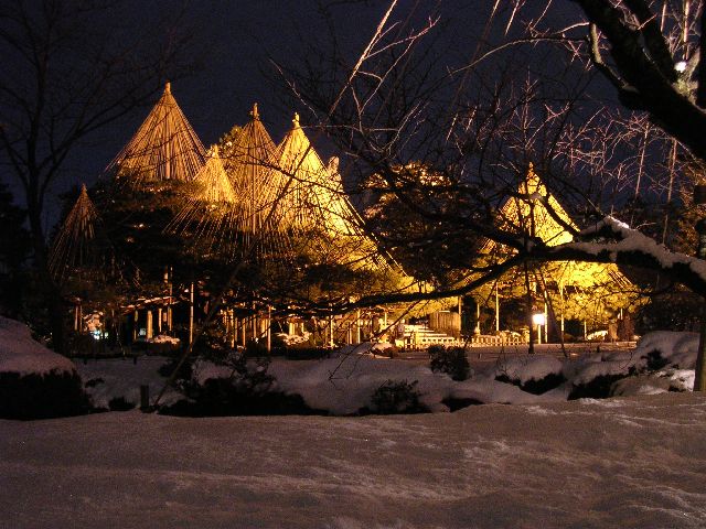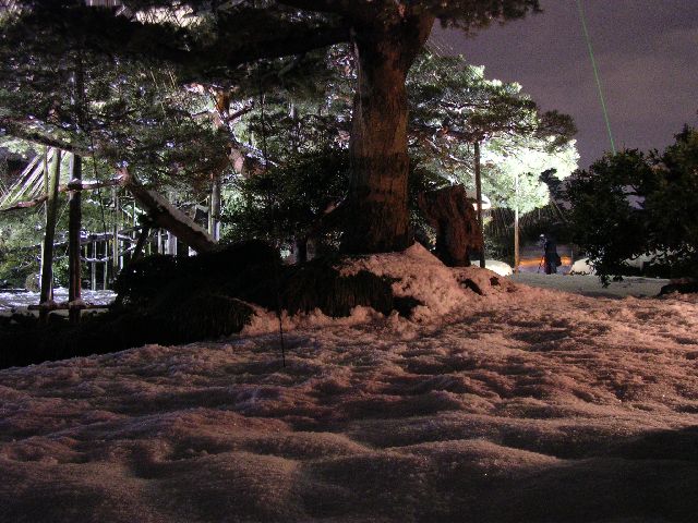 | Inside Kenrokuen park in Kanazawa. The ropes you see from the tops of the trees are put there by the gardener so the weight of the snow won't make the trees sag. |
