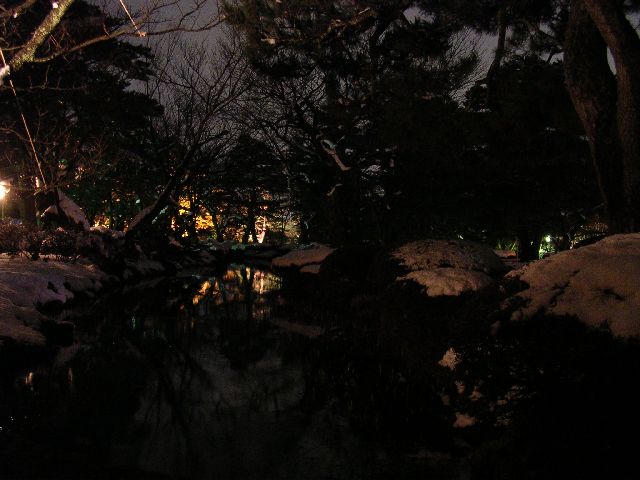 | Inside Kenrokuen park in Kanazawa. Taken from a small bridge that goes over a tiny stream. |