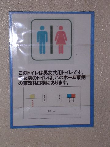 | On the way back, I stopped in the bathroom at the station in Himeji. I was surprised when a woman walked in the bathroom and went in a stall as I was doing my business at the urinal. Turns out, it's a coed (unisex, konyoko, whatever you want to call it) bathroom. Both men and women go in. Yet another example of how men have no modesty here. This sign simply explains that this is a mixed use bathroom and direct objectors to the nearest gender separated bathroom. |