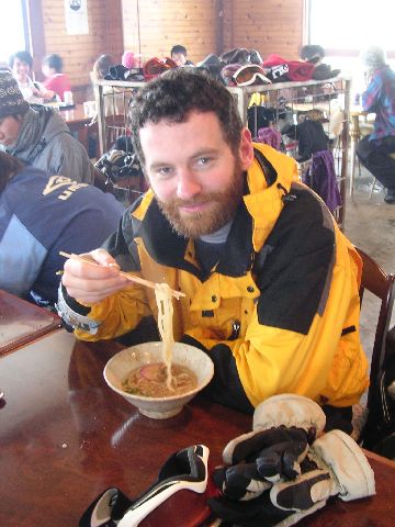 | Eating udon (thick noodles) in one of the lodges. |