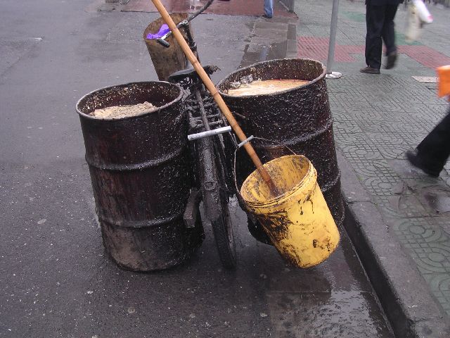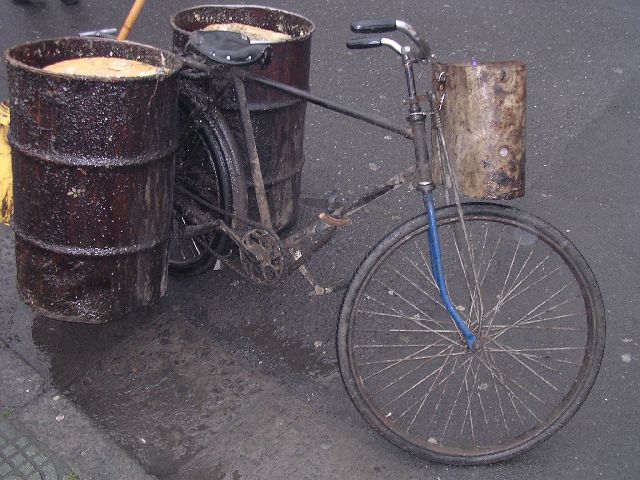 thumbnailSpeaking of pretty pictures, I found this bicycle in downtown Hangzhou.  People carry lots of huge and odd things on bicycles.  This was hardly the largest I saw, but it was one of the stranger things.  Two huge, full barrels of slop.  I guess pigs eat this stuff.  Who knows where it came from.  Street cleaning refuse maybe?