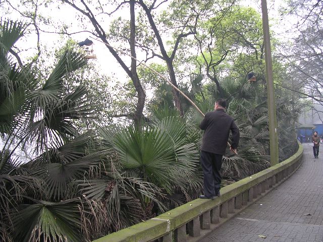| This guy just fed one of the birds. Now, he's hanging the bird back up in a tree. |