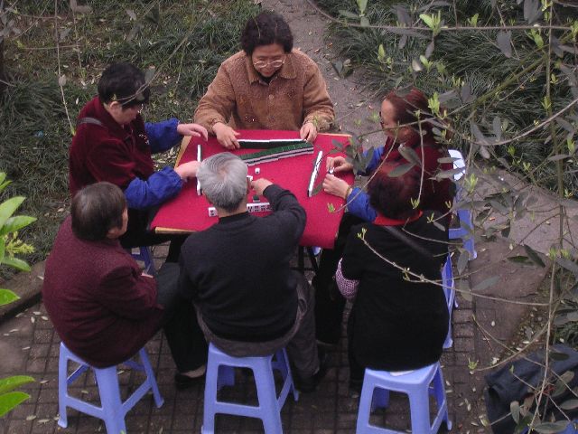 | These folks are playing Mahjong, a famous Chinese game played all over China, and often played in Japan as well. |