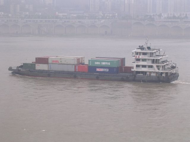 | Eventually, we reached the water. It was the Yangtze River. This container barge caught my interest because it is carrying a container that says "China Shipping". That's interesting because I see "China Shipping" containers in Seattle all the time. |