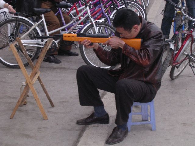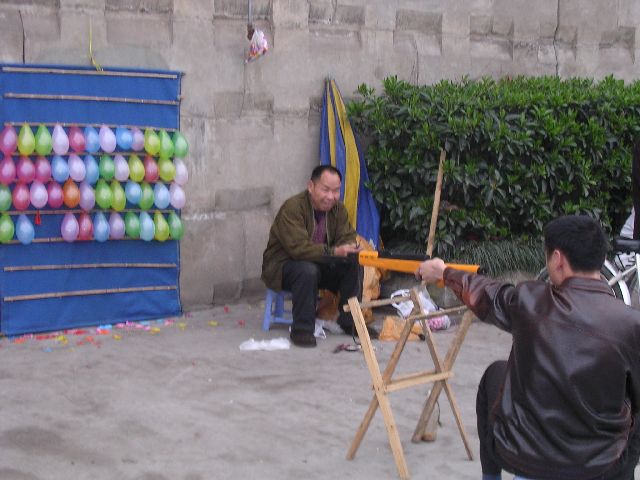 | As we walked on and on, I felt like I needed some stimulus. I really wanted to shoot a gun. I started talking about it. Just by chance, we ran into this guy who would let you shoot his BB gun at some balloons for about 38 cents. You could shoot out about 40 balloons for that price. He was a nice guy, too. |