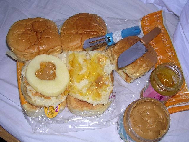 thumbnailThis was our breakfast, lunch, and dinner for the whole time we were on the boat.  Peanut butter, jelly, white bread rolls, apples, sunflower seeds, peanuts, pomolo (a kind of fruit like a giant grapefruit), and water.