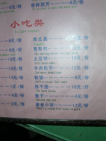 thumbnailOne page of the menu.  Soil bean cake.  (In Chinese, the characters for soil and bean combine to mean potato.  So, this is actually a potato cake of some sort.) Also, "the heat fucks", "spread the son", and "small a round flat cake in gold".