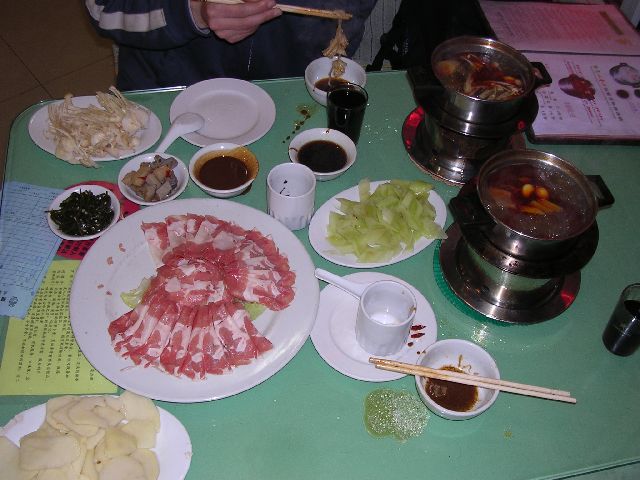 For dinner, we walked around for well over an hour.  Finally, we decided to eat "hot pot", a Chinese dish similar to the Japanese shabu-shabu.  They put a little stove on your table along with a pot of broth.  Then, you order various ingredients to go in your stew.  We ordered thinly sliced lamb, mushrooms, cucumber, greens, and various other stuff.