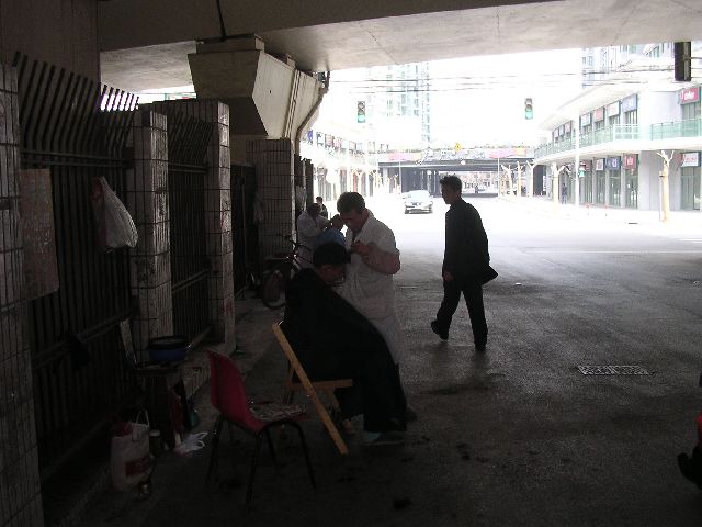 | In Shanghai, we saw this funny barbershop. A man has a chair set up under an highway overpass with cars zooming by. For a fee, he'll cut your hair right there. Strange, huh? |