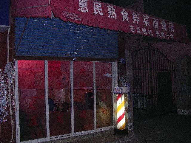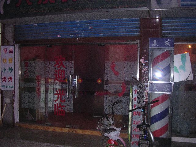 As we walked, we went through a prostitution area. Like Japan, prostitution in China is technically illegal but ubiquitous. Brothels usually are lightly disguised as barbershops with barber poles outside. The windows are always pink. Through the windows you can always see younger (20's, 30's) women, fully dressed like anybody else. (For the record, I did not set foot in one or do anything other than look from the sidewalk. That should go without saying.)
