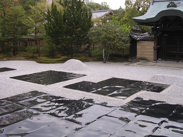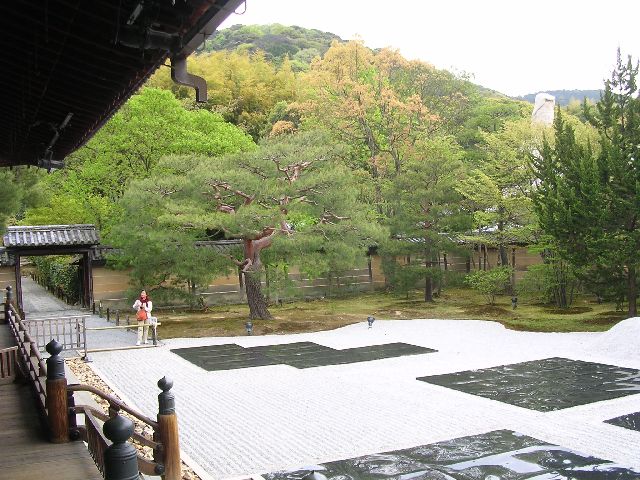 | This is in the garden. In the foreground is a rock garden with traditional mounds and raked patterns in the gravel. In the background is a bunch of nice trees. |
