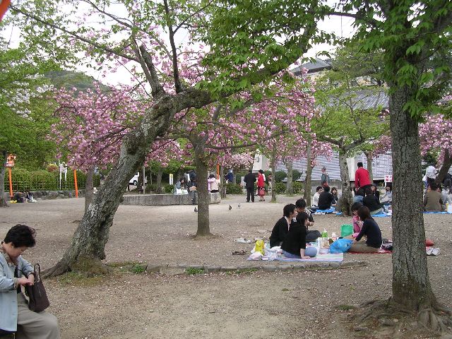 | Outside the gates of the temple area, we saw people enjoying the cherry blossoms. Cherry blossoms are gone in Aioi, but Kyoto is further north, so some varieties of cherry trees are still in bloom in Kyoto. |