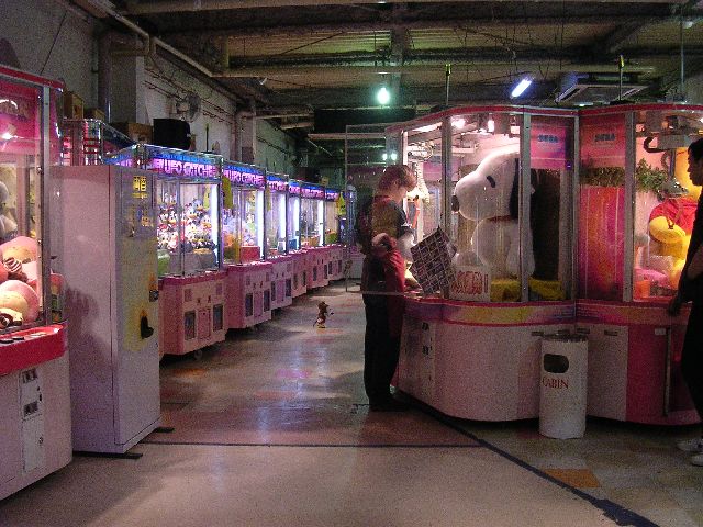 | This establishment is full of little crane games where you pay money to try to fetch a stuffed animal or other object of nominal value. |