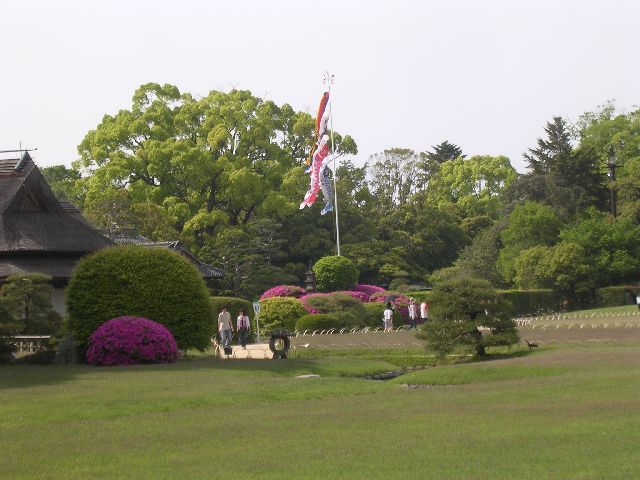 | Okayama's Korakuen Garden - carp windsocks flying for Children's Day |