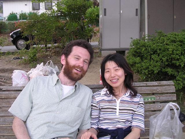 In the morning, we had a barbecue at the little park a block from my home. Mr. Minato organized the barbecue. Several members of his immediate and extended family came, as well as foreigners from around the area. It was lots of fun. We barbecued steak, chicken, vegetables, rice balls (onigiri), sausages, corn, fish, shrimp, and whatever else people brought. We played with Mr. Minato's son and nephew, who are around 10 years old.