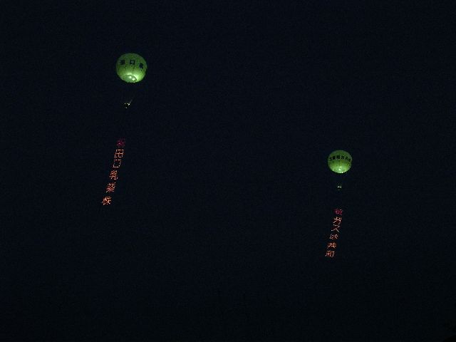 | I saw these illuminated advertisements flying in the air. At least one of them is about a gas company. |