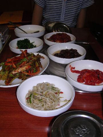 thumbnailFirst, the typical Korean layout of all kinds of pickled vegetables and seafood.  (Somehow, I can't remember how to spell kim chi in English at the moment.  Maybe it will come to me later.)
