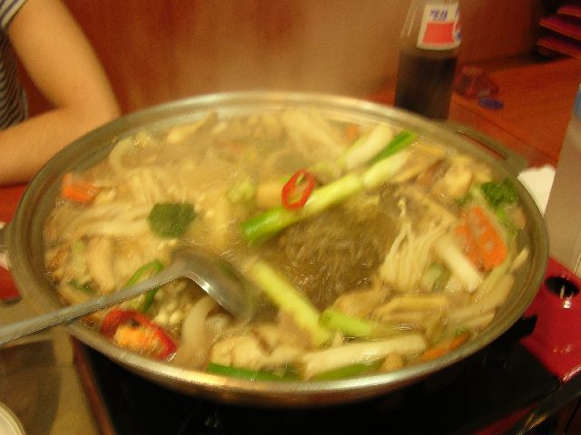 thumbnailAnd, on to the main course, an undeniably delicous soup with beef and vegetables.  Like so much food I've eat in Korea and Japan, it's made right in front of you on a burner in the middle of your table.