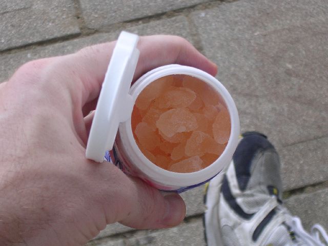 | Little rocks of ice coated with a tart peach flavor. You pop a few in your mouth. You immediately pucker from the sour peach flavor. Then, it comes off and you're left with plain old ice in your mouth which melts, makes you cool, and washes away the sour peach stuff. It's really nice. Akemi says she's had it in Japan as well. I've never seen it here. |