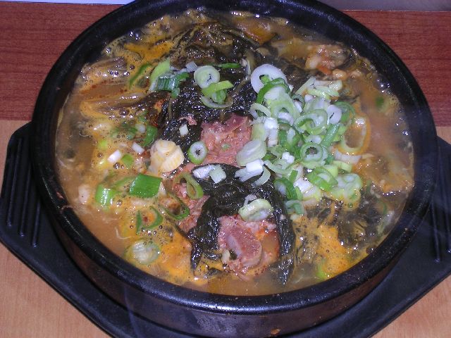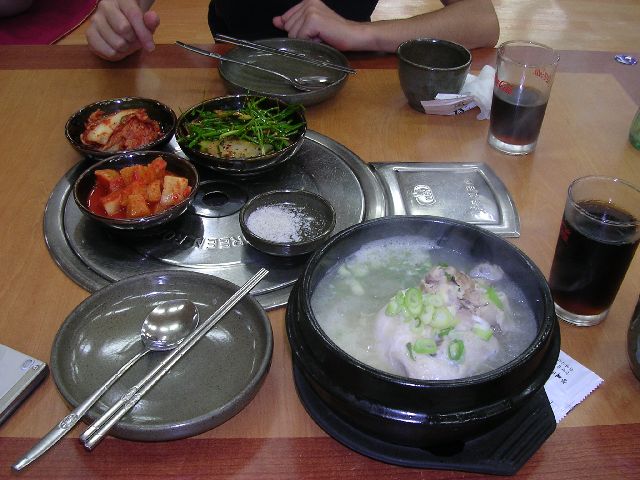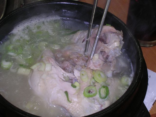 | A hearty chicken soup. Along side the soup were all kinds of kimchi and stuff. This is very typical Korean style. |