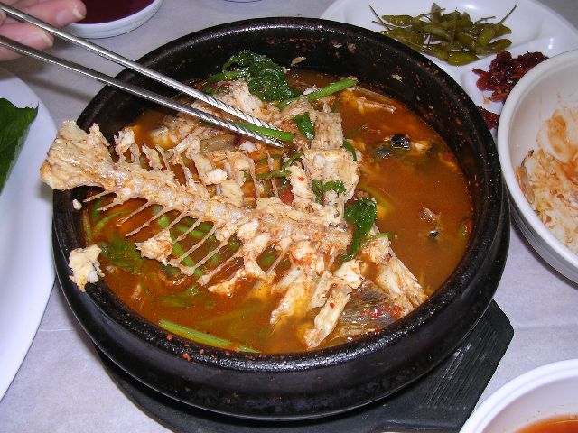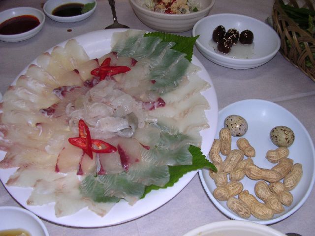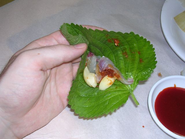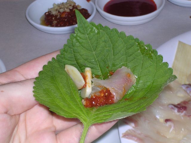 thumbnailEating raw fish in Korea is like other things in Korea.  You wrap it in a leave along with lots of RAW garlic, sauce, and whatever else you want.