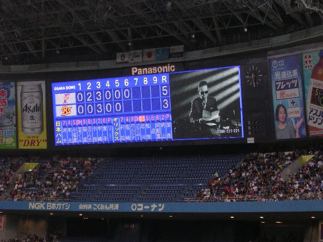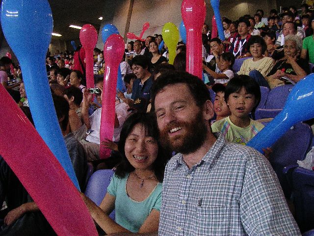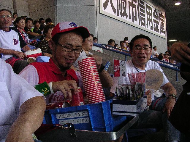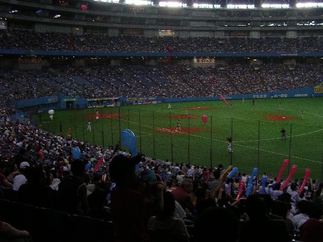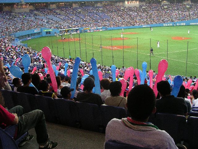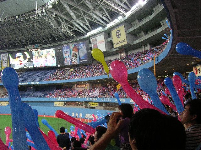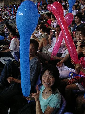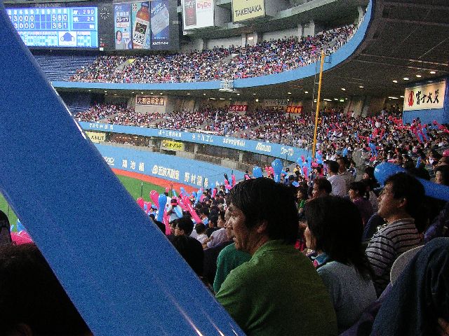 Anyway, the game was the Orlix Blue Waves of Osaka versus a team from Yokohama.  Not being big baseball fans, we arrived late.  We discovered the entire general admission area was full.  Standing room only.  But, we got really lucky.  We bumped into the president of the Blue Waves fan club.  He had a few seats reserved for friends with coats.  He let us sit down.  Not only that, but he brought us free beer, ice cream, cheering implements - the works.  He really treated us well, I guess because I'm a foreigner from a famous baseball city and it was my first game in Japan.  (Recall that Seattle is famous in Japan for the Seattle Mariners which currently employ Ichiro Suzuki, a Japanese player.)