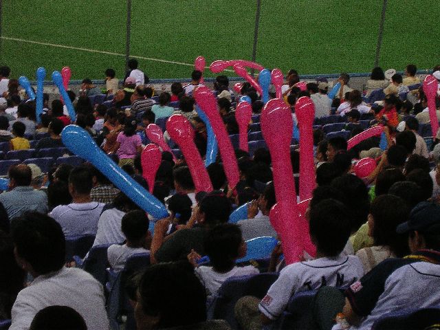 Now, here is the most amusing part of it.  They have these rubber things, like long balloons, like the ones clowns use to make balloon animals.  There's a little piece of plastic in the mouth of the thing.  You blow it up.  Then, you let it go at a designated time.  It flies around and makes noise.  It's really fun.  As I recall, everybody lets them go at the end of the 7th inning.  It's a ritual for fans of this team.