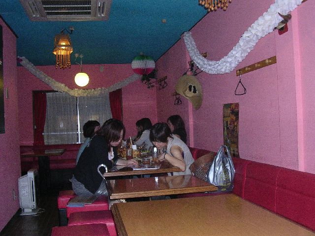 | The ambiance at the restaurant, which is located just outside America-mura in the Shinsaibashi neighborhood of Osaka. Although there are Japanese people in this picture, this place actually attracts a huge number of foreigners. America-mura, despite the name, is still made up of 97% Japanese people. But, the people at this restaurant said it's generally about half foreigners. At one point while we were there, there were about 7 foreigners and 6 Japanese people in the restaurant. |