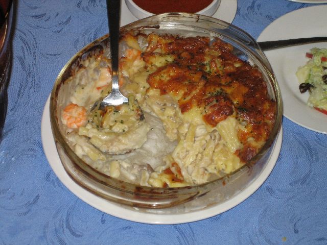 | This casserole was a hit. Sort of a baked cheese gratin with shrimp in it. |