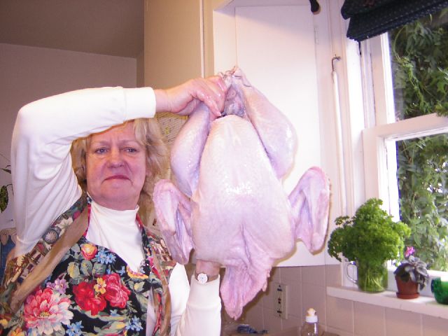 | I just love this picture of my mom, which Akemi took. My mom was trying to show Akemi the turkey. (They don't generally have turkeys in Japan. Akemi had never seen one.) But, I rather like my mom in this picture. It's charming. |