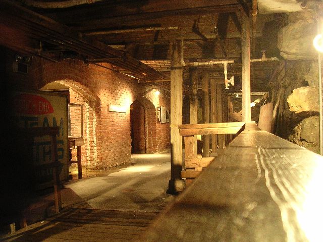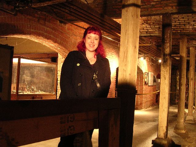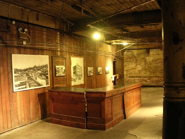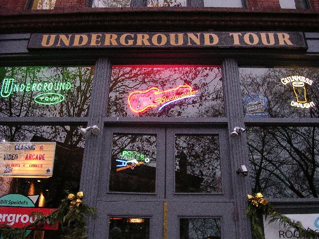 | One of the highlights of the day was a tour of the old streets under parts of downtown. After downtown Seattle burned down in a big fire, parts of it were rebuilt at an elevated level with elevated streets and shop fronts. You can go under the city and see what's there, while hearing a lecture by some people who know Seattle's history well. Interestingly enough, many of the tour guides are primarily actors, and learned the history later. They know the history very well. The guides are all excellent. Clearly serious about what they do. |