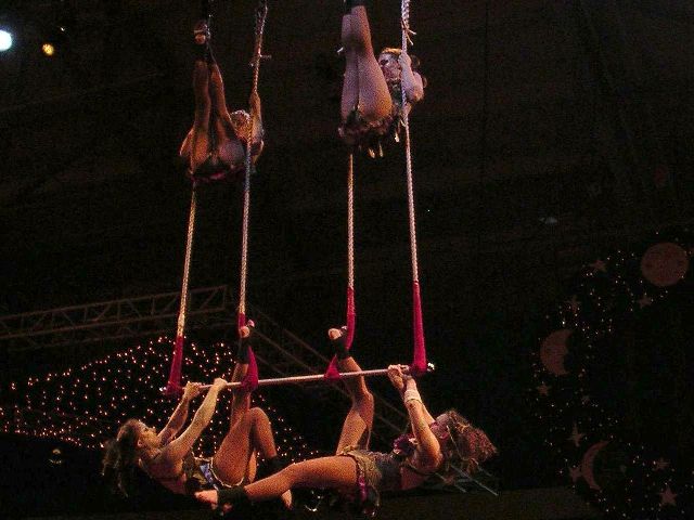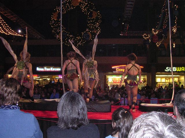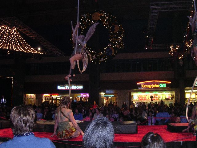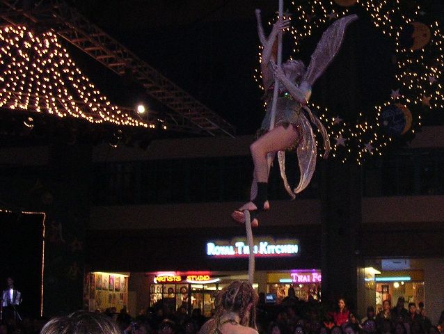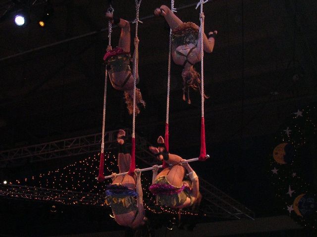 In the Center House, they had a band called Circus Contraption playing circus music. After a set of music only, they were joined by an all-girl acrobatics group. They were really impressive. I guess acrobats are supposed to be impressive. Skillful, graceful, and artful. I snapped a bunch of pictures. I won't bother to explain each one. Many of their routines involved climing up on a rope, gracefully wrapping the rope around their bodies, and then suddenly letting go. When they let go, the rope would become tied around their legs and it would catch them. If you've got a fast connection, try a couple of the movies.