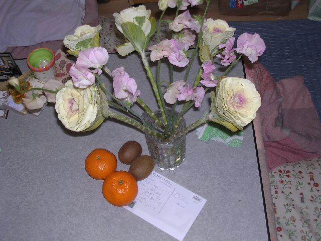 | I left some flowers for Akemi. I thought they were rather interesting looking, so I took a picture. The pink ones are, of course, snapdragons. The bigger things are a special ornamental cabbage that is popular in Japan as a New Year's decoration. |