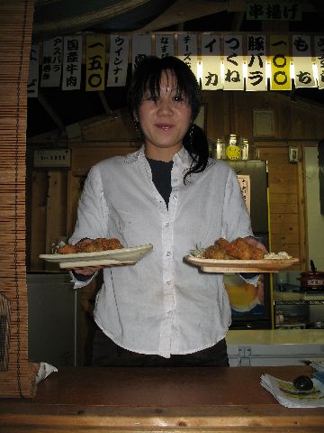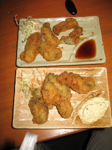 Just as I did a few days ago, I went down to the little village of huts near the station for some fried oysters. I love the oysters around here. They're delicious, very fresh, and local (a nice intangible quality). This was my second time at Miwa's little shop. Miwa is the owner. She is native to Aioi. Anyway, basically I just wanted to put her picture and these oysters up on my web page. Note that I got two this time because they were so good the last time. This was my dinner.