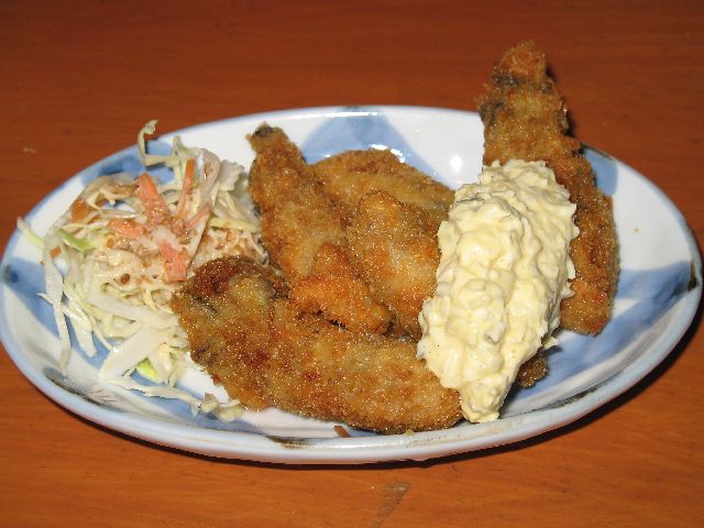Lately, I've been eating a lot of oysters. They are grown, harvested, and processed right here in Aioi, so they're very fresh. Usually, when I get them, they are the previous day's harvest. Almost everyday, I stop in at one of the little shops near the station for one or two orders of deep-fried oysters. Today's oysters were especially delicious.