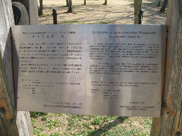 thumbnailAccording to the sign, it was placed here in commemoration of the World Performing Arts Festival of 2000.  It was "produced by Mr. Guujaaw, an artist of Haida natives, aborigines of the Queen Charlotte Islands on the West Coast of Canada." It is made of Canadian red cedar.  It is 6 meters tall, 70 centimeters in diameter, and weighs 1450 kilograms (3194 pounds).