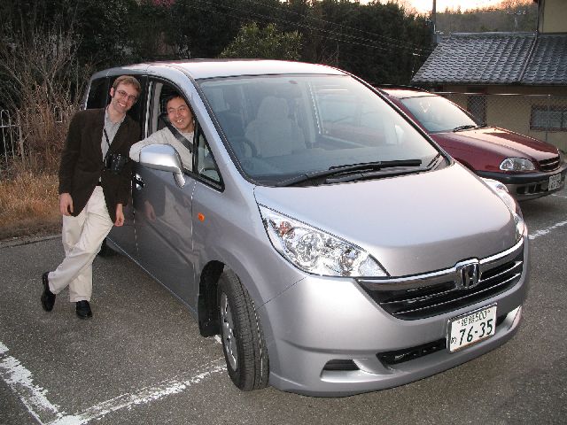 | Here's Mr. Minato and Nate next to his new car, a minivan. It's some kind of Honda. The sliding door closes partially automatically. |
