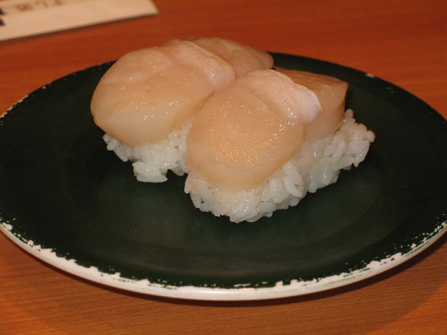 | This evening, we went to Akane-no-yu, our favorite public bath. As usual, we stopped for dinner before the bath. Mr. Minato's mother and his wife's mother both came along with us, so we went to an extra good conveyor belt sushi place. This is my very favorite kind of sushi. It's a raw scallop over rice with a little wasabi in between. It tastes very fresh. |