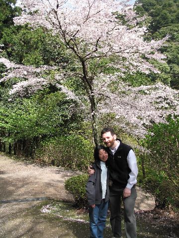 thumbnailAfter walking around and talking a little about the future and stuff, I proposed to her right here under the cherry tree in the middle of the picture.  It was perfect - nobody in sight, sun shining, cherry blossoms raining down on us, everything a marriage proposal is supposed to be.  She immediately started crying.  As for myself, my eyes might have, um, "sweated" a few drops, too.  (Yeah, I know it's weird to put this in my online journal, but after some thinking and discussion with Akemi, I decided it should be a part of my record of the Japan trip.  Excluding it would be even stranger than including it.)